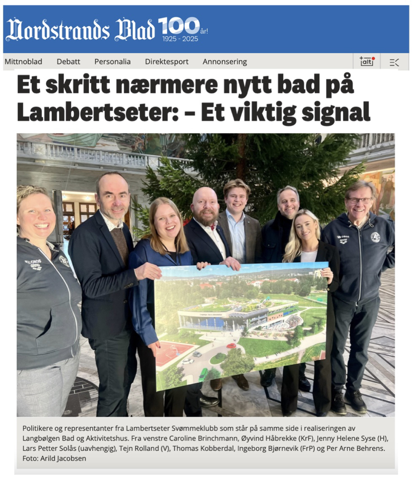 Politikere og representanter fra Lambertseter Svømmeklubb som står på samme side i realiseringen av Langbølgen Bad og Aktivitetshus. Fra venstre Caroline Brinchmann, Øyvind Håbrekke (KrF), Jenny Helene Syse (H), Lars Petter Solås (uavhengig), Tejn Rolland (V), Thomas...